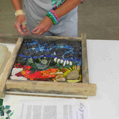 Nach der Einführung in Techniken und Beispiele der Mosaikgestaltung aus Naturstein erfolgt unter der Anleitung von Robert Kaller (Master of Fine Arts) zunächst das Setzen des eigenen Mosaiks im Sandbett. Die Teilnehmer ‚spielen‘ mit den reichhaltigen Materialen des Ateliers, knacken Steine und gestalten nach eigenen Ideen. Auch eigene ‚Schätze‘ werden hierbei eingebracht.