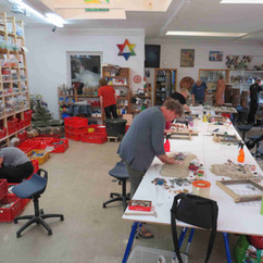 Zur Freude der Teilnehmer arbeitet Gert Neumann, Student des dritten Ausbildungsjahres der Mosaikbauschule, gleichzeitig an seiner Abschlussarbeit in den Atelierräumen, so dass interessante Einblicke in eine solche Arbeit möglich werden.