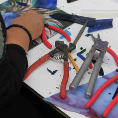 Marita erklärt die digitale Formatierung der Vorlage und die Übertragung und Vorbereitung für das anschließende Mosaizieren. Dabei kommen dieses Mal insb. Mosaikzange, Kröselzange und Radschneider zum Einsatz.