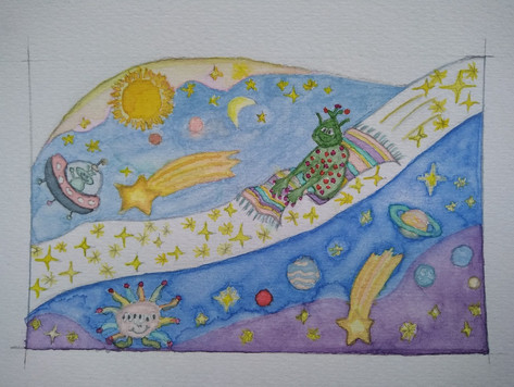 Die Schüler der Grundschule haben sich als Ausgangspunkt der Gestaltung ein Bild der Schöpfung gewünscht, vom Meer aufsteigend über Blumen, Gräser, Bäume hin zum Himmel und zu den Sternen und Planeten.