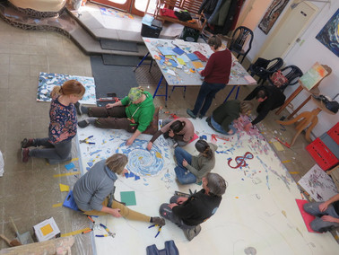In einem beeindruckenden sozialen Konsens haben 18 Studenten*innen der Mosaikbauschule Dortmund an einem 20 qm keramischen Wandmosaikentwurf mit Natursteinelementen gearbeitet und haben dabei hochkonzentriert Farbklänge, Rhythmen und grafische Linienverläufe komponiert, Formatives und Informatives versöhnt und wertvolle handwerklich künstlerische Erfahrungen gesammelt.