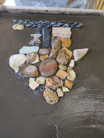 Heute wurden die Natursteinmosaikentwürfe, die gestern in Sand gesetzt worden waren, in Beton umgesetzt.
