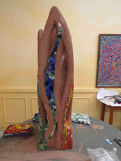 Dann wird der Formentwurf verputzt und mit ersten Mosaikflächen versehen. So entstehen u.a. auch ‚Löcher‘ in der Form, die man z.B. auch mit farbigem Glas füllen kann.