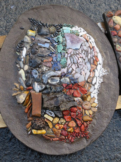 Nach dem Abbinden des Betons können die am Wochenende im Laienworkshop "Zauber des Natursteins" entstandenen Natursteinmosaiken aus der Schalung genommen werden, die Ränder/Kanten werden geraspelt/geschliffen und die hinteren Haken/eingegossenen Aufhängungen werden überprüft.